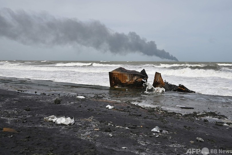 インド東部に上陸したサイクロンに伴う強風により、消火作業は難航。船体からは大きな黒煙が立ち上っている。スリランカ空軍は26日、ヘリコプターで難燃剤約425キロを散布。スリランカの海洋環境保護局(MEPA)は、化学物質や燃料が流出する事態に備え、封じ込め措置を準備していると発表した。(c)AFP