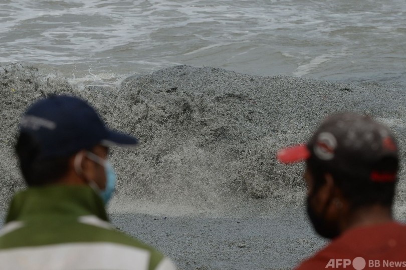 インド東部に上陸したサイクロンに伴う強風により、消火作業は難航。船体からは大きな黒煙が立ち上っている。スリランカ空軍は26日、ヘリコプターで難燃剤約425キロを散布。スリランカの海洋環境保護局(MEPA)は、化学物質や燃料が流出する事態に備え、封じ込め措置を準備していると発表した。(c)AFP