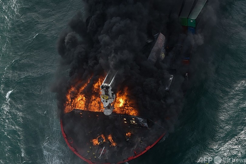 インド東部に上陸したサイクロンに伴う強風により、消火作業は難航。船体からは大きな黒煙が立ち上っている。スリランカ空軍は26日、ヘリコプターで難燃剤約425キロを散布。スリランカの海洋環境保護局(MEPA)は、化学物質や燃料が流出する事態に備え、封じ込め措置を準備していると発表した。(c)AFP