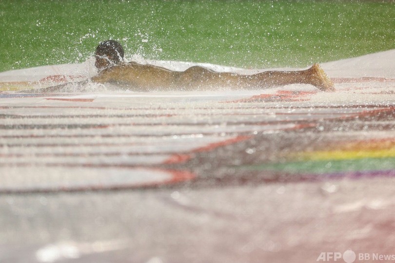 【5月27日 AFP】26日に行われた米大リーグ(MLB)、ワシントン・ナショナルズ(Washington Nationals)対シンシナティ・レッズ(Cincinnati Reds)が雨天中断となる中、ナショナルズ・パーク(Nationals Park)のフィールドに全裸の男性が乱入した。男性は雨よけシートの上を水しぶきを上げて滑り、シートロールに潜り込んだが、最後は警備員に取り押さえられた。