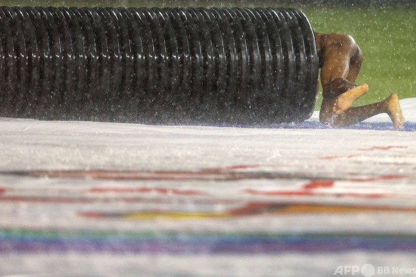 【5月27日 AFP】26日に行われた米大リーグ(MLB)、ワシントン・ナショナルズ(Washington Nationals)対シンシナティ・レッズ(Cincinnati Reds)が雨天中断となる中、ナショナルズ・パーク(Nationals Park)のフィールドに全裸の男性が乱入した。男性は雨よけシートの上を水しぶきを上げて滑り、シートロールに潜り込んだが、最後は警備員に取り押さえられた。
