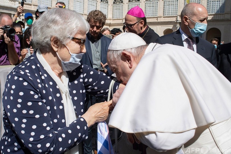 【5月27日 AFP】ローマ・カトリック教会のフランシスコ教皇(Pope Francis)は26日、バチカンを訪れたアウシュビッツ(Auschwitz)強制収容所の生存者の女性と会い、腕に残る囚人番号の入れ墨に口づけをした。