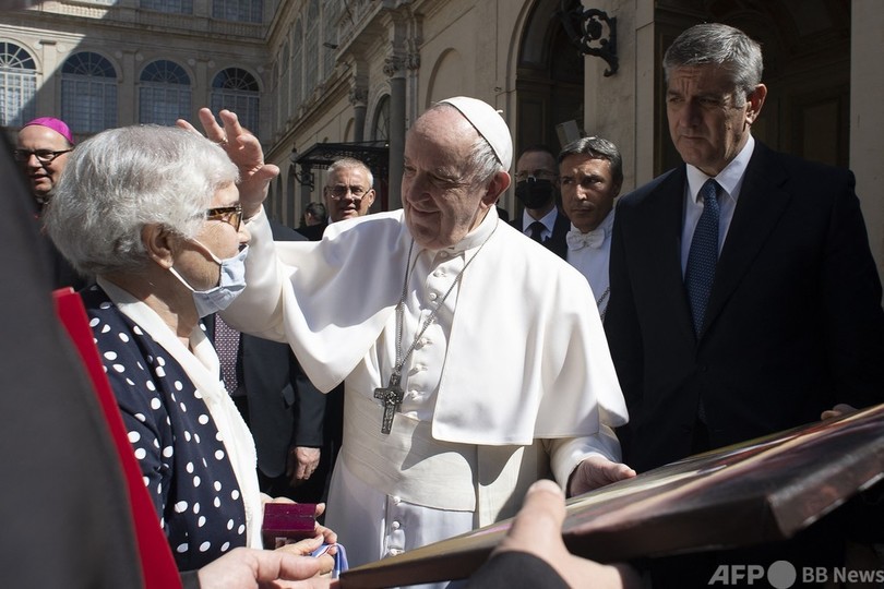 【5月27日 AFP】ローマ・カトリック教会のフランシスコ教皇(Pope Francis)は26日、バチカンを訪れたアウシュビッツ(Auschwitz)強制収容所の生存者の女性と会い、腕に残る囚人番号の入れ墨に口づけをした。