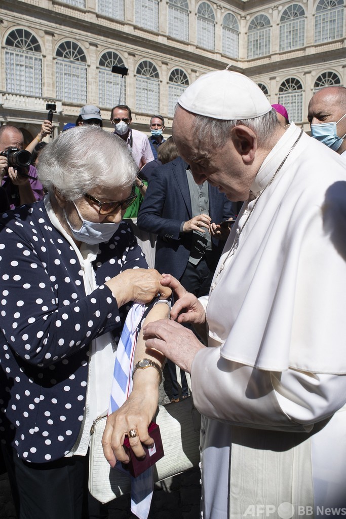 【5月27日 AFP】ローマ・カトリック教会のフランシスコ教皇(Pope Francis)は26日、バチカンを訪れたアウシュビッツ(Auschwitz)強制収容所の生存者の女性と会い、腕に残る囚人番号の入れ墨に口づけをした。