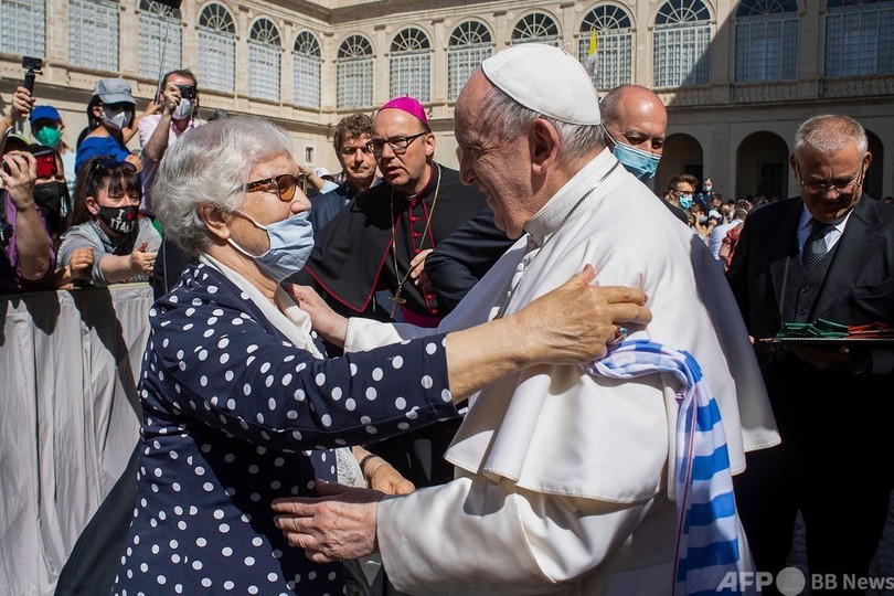 【5月27日 AFP】ローマ・カトリック教会のフランシスコ教皇(Pope Francis)は26日、バチカンを訪れたアウシュビッツ(Auschwitz)強制収容所の生存者の女性と会い、腕に残る囚人番号の入れ墨に口づけをした。