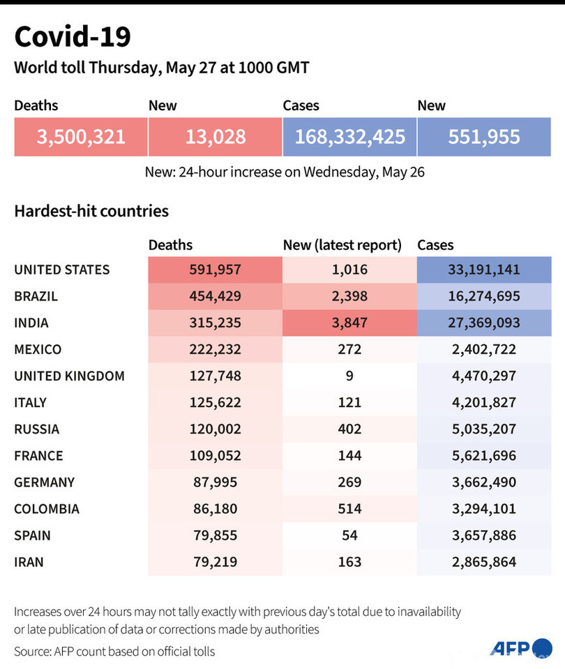 【5月28日 AFP】AFPが各国当局の発表に基づき日本時間27日午後7時にまとめた統計によると、世界の新型コロナウイルスによる死者数は350万321人に増加した。
