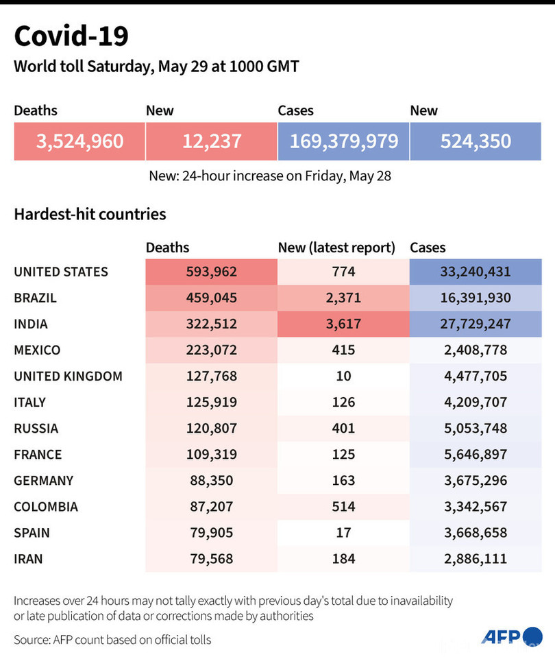 【5月29日 AFP】AFPが各国当局の発表に基づき日本時間29日午後7時にまとめた統計によると、世界の新型コロナウイルスによる死者数は352万4960人に増加した。