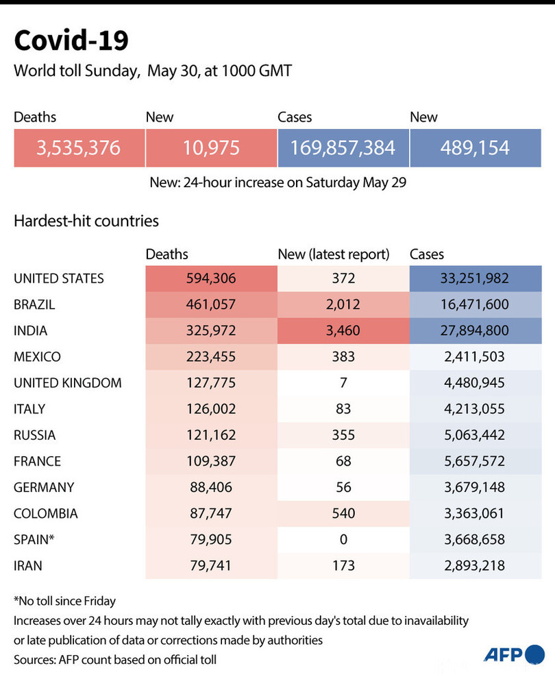 【5月31日 AFP】AFPが各国当局の発表に基づき日本時間30日午後7時にまとめた統計によると、世界の新型コロナウイルスによる死者数は353万5376人に増加した。
