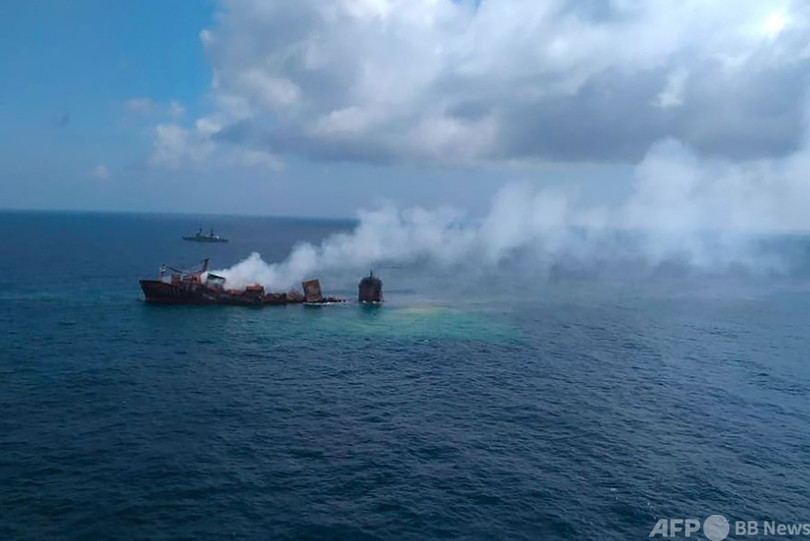 【6月2日 AFP】(写真追加)スリランカ海軍は2日、火災に見舞われ、同国史上最悪の海洋環境災害を引き起こしたコンテナ船が、燃料油数百トンを積んだまま沈み始めたと発表した。