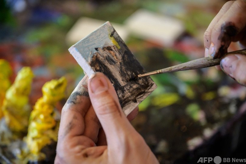 絵の大きさは、5センチ×3.8センチほど。1時間ほどで描き上がるが、小さな作品は絶対に販売しないという。
