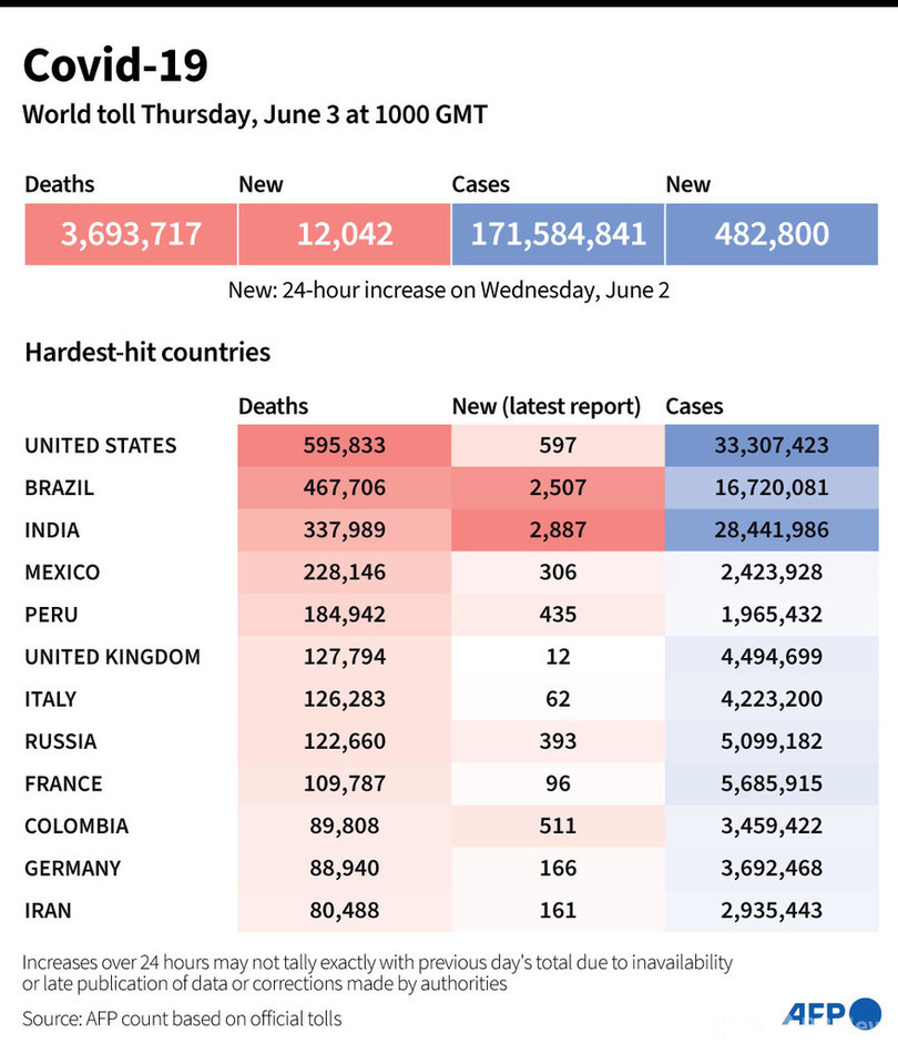【6月4日 AFP】AFPが各国当局の発表に基づき日本時間3日午後7時にまとめた統計によると、世界の新型コロナウイルスによる死者数は369万3717人に増加した。