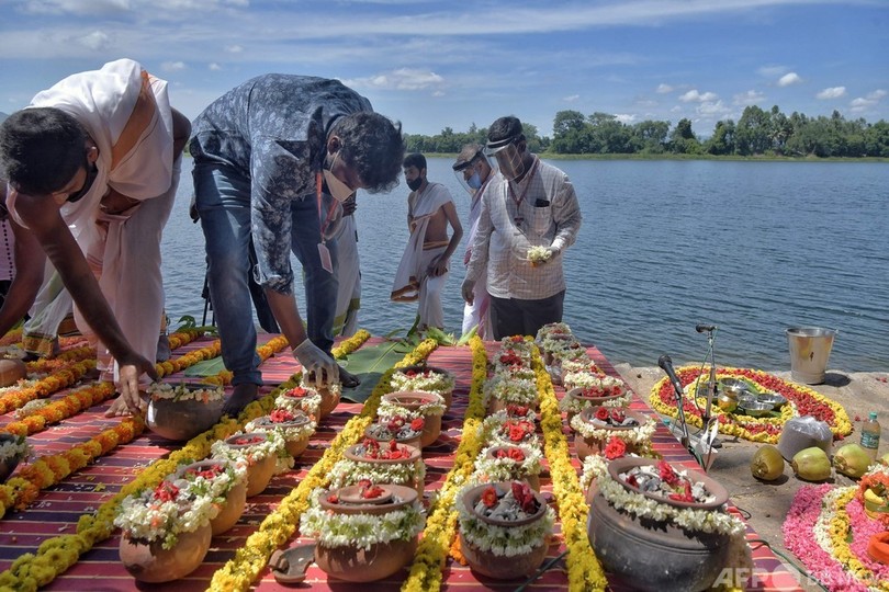 骨つぼは2日、カーベリ(Cauvery)川の岸辺に運ばれ、同じく引き取り手のない遺骨とともに水葬された。こうした引き取り手のない骨は、新型コロナウイルスによる死者のもので、計1200柱に上る。