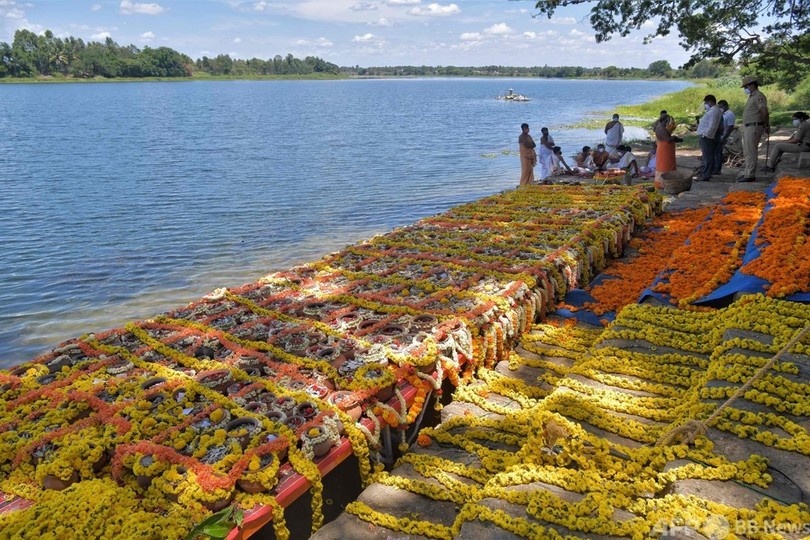 骨つぼは2日、カーベリ(Cauvery)川の岸辺に運ばれ、同じく引き取り手のない遺骨とともに水葬された。こうした引き取り手のない骨は、新型コロナウイルスによる死者のもので、計1200柱に上る。