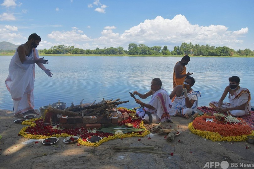 骨つぼは2日、カーベリ(Cauvery)川の岸辺に運ばれ、同じく引き取り手のない遺骨とともに水葬された。こうした引き取り手のない骨は、新型コロナウイルスによる死者のもので、計1200柱に上る。