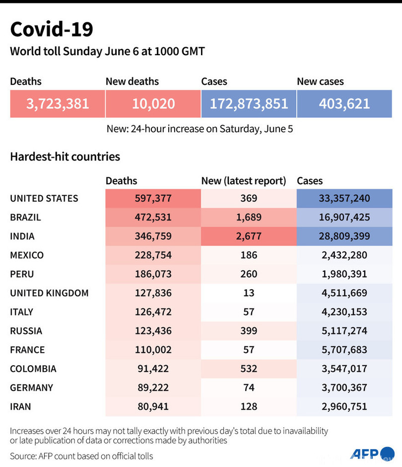 【6月7日 AFP】AFPが各国当局の発表に基づき日本時間6日午後7時にまとめた統計によると、世界の新型コロナウイルスによる死者数は372万3381人に増加した。