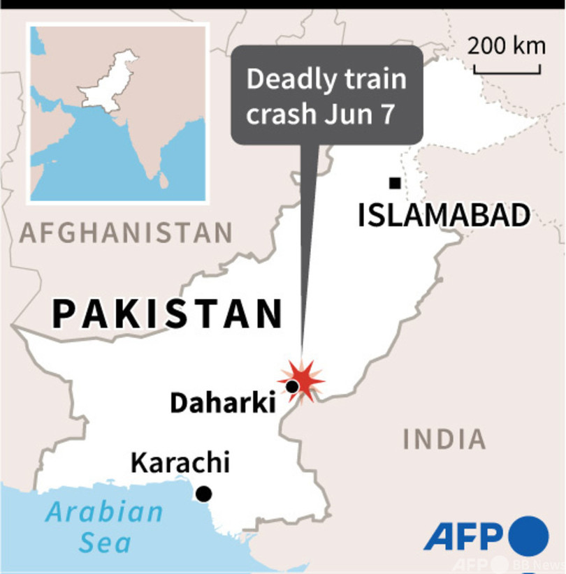 【6月7日 AFP】(更新、写真追加)パキスタン南部シンド(Sindh)州で7日、脱線した急行列車に対向してきた別の急行列車が衝突する事故があり、警察によると少なくとも34人が死亡した。負傷者も数十人に上っている。
