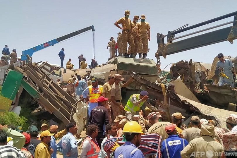【6月7日 AFP】(更新、写真追加)パキスタン南部シンド(Sindh)州で7日、脱線した急行列車に対向してきた別の急行列車が衝突する事故があり、警察によると少なくとも34人が死亡した。負傷者も数十人に上っている。