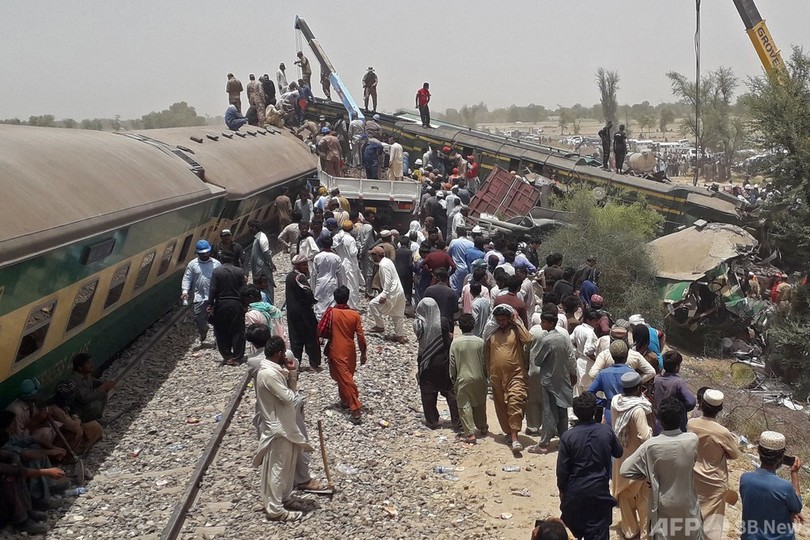 【6月7日 AFP】(更新、写真追加)パキスタン南部シンド(Sindh)州で7日、脱線した急行列車に対向してきた別の急行列車が衝突する事故があり、警察によると少なくとも34人が死亡した。負傷者も数十人に上っている。