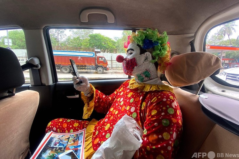 「新型コロナのパンデミック(世界的な大流行)が収束するまで、ピエロの格好で訪問し、人々の助けになりたい」(c)AFP