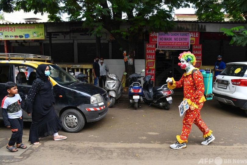 【6月13日 AFP】インド西部ムンバイ(旧ボンベイ)のスラムで、アショーク・クルミ(Ashok Kurmi)さん(37)はピエロの格好をして、子どもたちに新型コロナウイルス対策を広めている。