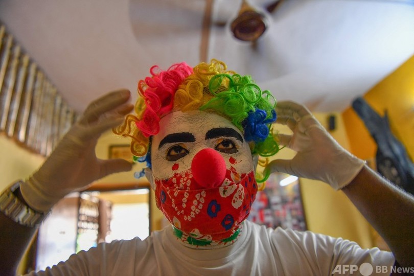 「新型コロナのパンデミック(世界的な大流行)が収束するまで、ピエロの格好で訪問し、人々の助けになりたい」(c)AFP