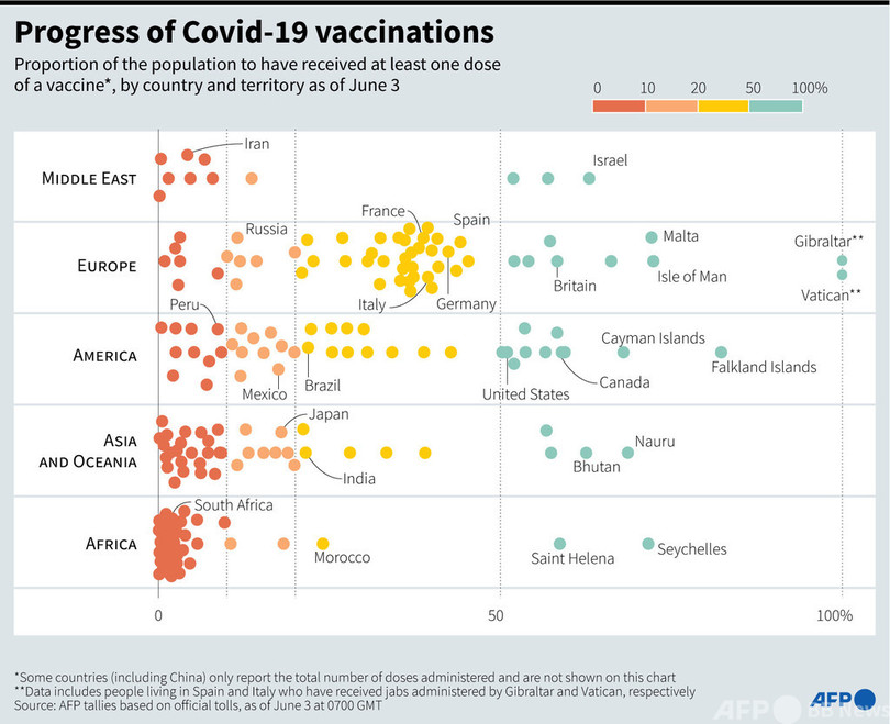 ワクチンの初期製造分は大部分が富裕国により買い占められており、米国は世界的なワクチン不足への対処を求められていた。米国では全人口の半数以上がワクチン接種を完了し、感染ペースは急低下している。