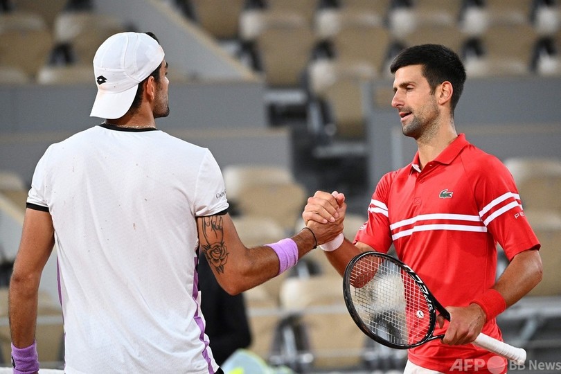 世界1位のジョコビッチは6-3、6-2、6-7(5-7)、7-5で第9シードのマッテオ・ベレッティーニ(Matteo Berrettini、イタリア)を下し、四大大会(グランドスラム)通算40回目、全仏では通算11回目の4強入りを果たした。