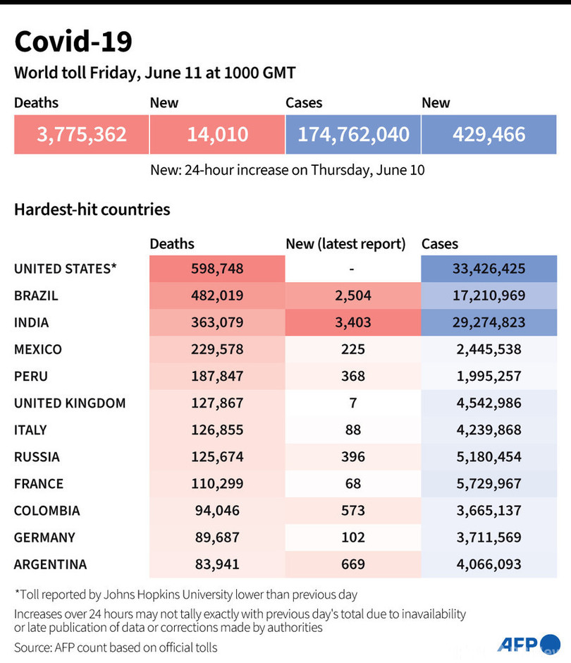 【6月12日 AFP】AFPが各国当局の発表に基づき日本時間11日午後7時にまとめた統計によると、世界の新型コロナウイルスによる死者数は377万5362人に増加した。