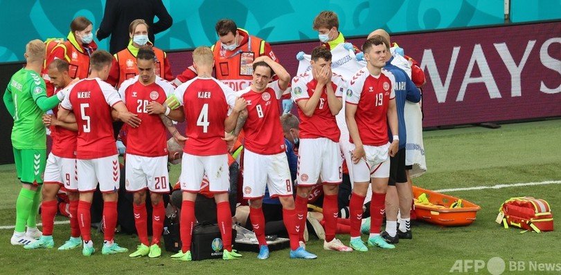 イタリア・セリエAのインテル(Inter Milan)に所属するエリクセンは、前半終盤にタッチライン付近で突然倒れた。医療スタッフがCPR(心肺蘇生法)を施す中、チームメートはエリクセンを囲むようにして集まり、涙を流す選手もいた。首都コペンハーゲンのパルケン・スタジアム(Parken Stadium)に集まった母国の観客も沈黙した。(c)AFP