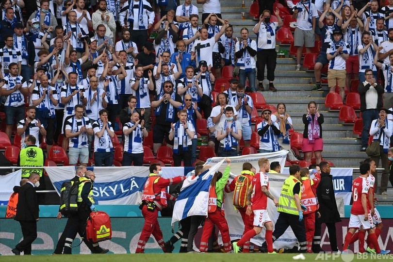 イタリア・セリエAのインテル(Inter Milan)に所属するエリクセンは、前半終盤にタッチライン付近で突然倒れた。医療スタッフがCPR(心肺蘇生法)を施す中、チームメートはエリクセンを囲むようにして集まり、涙を流す選手もいた。首都コペンハーゲンのパルケン・スタジアム(Parken Stadium)に集まった母国の観客も沈黙した。(c)AFP