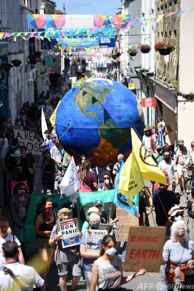 【6月13日 AFP】英コーンウォール(Cornwall)で12日、先進7か国(G7)首脳会議(サミット)に参加した各国首脳に気候変動対策や生物多様性の保全を訴えようと、大規模なデモが行われた。