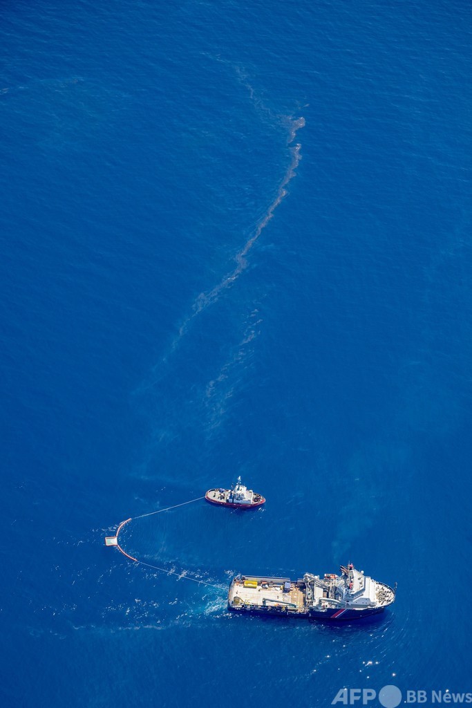 当局者はAFPに対し、「油膜は分散しており、現在約10キロ沖に位置している。海流によって状況が変わることもあるため、引き続き注意していく必要がある」と述べた。(c)AFP
