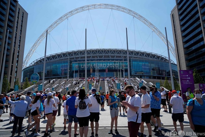 イングランドが1-0で勝利した試合は1万8497人が観戦。今大会ウェンブリーでは8試合が行われ、現時点で観客数の上限は収容人数の4分の1である2万2500人となっているが、準決勝2試合と決勝はより多くのファンを入れて行われる可能性がある。(c)AFP