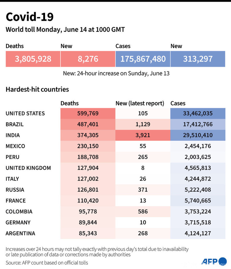 【6月14日 AFP】AFPが各国当局の発表に基づき日本時間14日午後7時にまとめた統計によると、世界の新型コロナウイルスによる死者数は380万5928人に増加した。