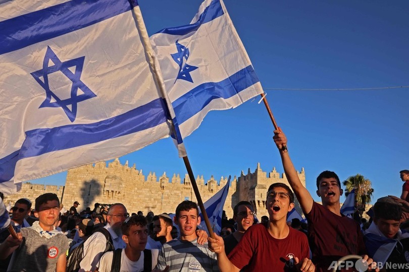 15日には、エルサレム(Jerusalem)の旧市街で、イスラエルが1967年にヨルダン領だった東エルサレムを占領して併合し、エルサレムが「再統一」された日として祝うデモ行進が行われ、イスラエルの国旗を掲げた超国家主義者1000人以上が参加した。