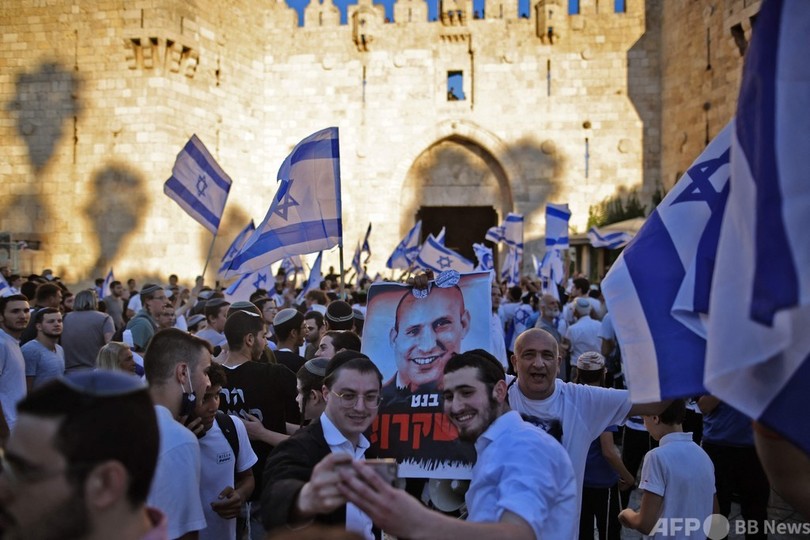 15日には、エルサレム(Jerusalem)の旧市街で、イスラエルが1967年にヨルダン領だった東エルサレムを占領して併合し、エルサレムが「再統一」された日として祝うデモ行進が行われ、イスラエルの国旗を掲げた超国家主義者1000人以上が参加した。