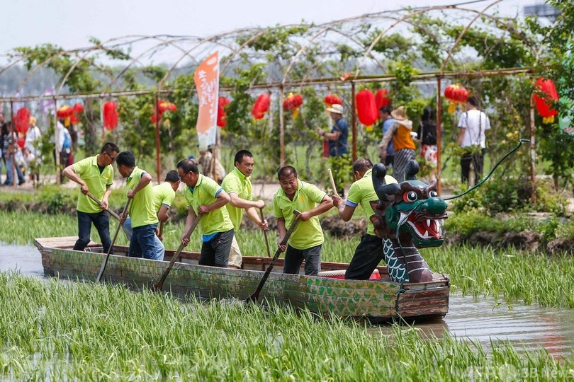 田んぼを進め! ドラゴンボート祭り 中国・遼寧省