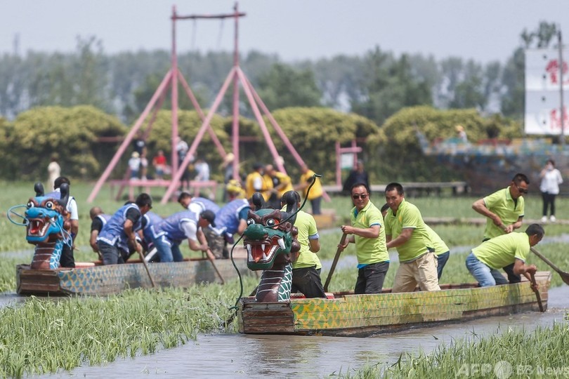 【6月16日 AFP】中国東北部遼寧(Liaoning)省瀋陽(Shenyang)で13日、ドラゴンボート祭り(Dragon Boat Festival)が開催され、参加者らが田んぼでボートをこぐ姿がみられた。(c)AFP