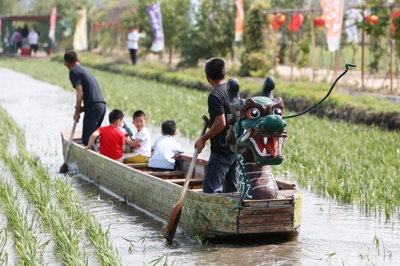 田んぼを進め! ドラゴンボート祭り 中国・遼寧省
