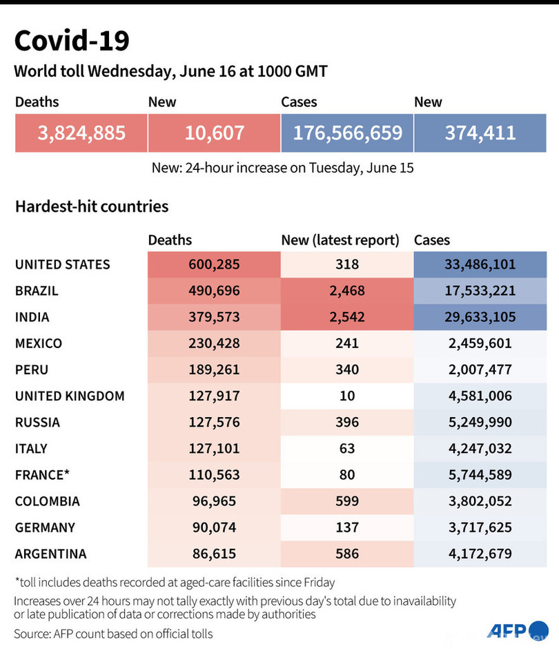 【6月16日 AFP】AFPが各国当局の発表に基づき日本時間16日午後7時にまとめた統計によると、世界の新型コロナウイルスによる死者数は382万4885人に増加した。