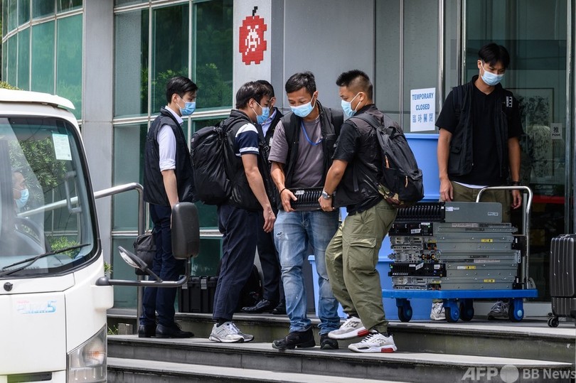 【6月17日 AFP】(更新、写真追加)香港警察は17日朝、民主派の現地紙「蘋果日報(アップル・デーリー、Apple Daily)」の事務所を家宅捜索し、羅偉光(ライアン・ロウ、Ryan Law)編集長ら幹部5人を、香港国家安全維持法(国安法)違反容疑で逮捕した。警察と同紙が同日、明らかにした。また、同法に基づき、蘋果日報の資産、計1800万香港ドル(約2億6000万円)が凍結された。