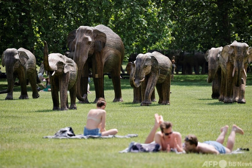 【6月26日 AFP】英ロンドン中心部のグリーンパーク(Green Park)に設置された実物大のアジアゾウの群れをかたどった彫刻。生物多様性やゾウとの共生について啓発するため、「エレファント・ファミリー(Elephant Family)」などの団体が設置した。(c)AFP