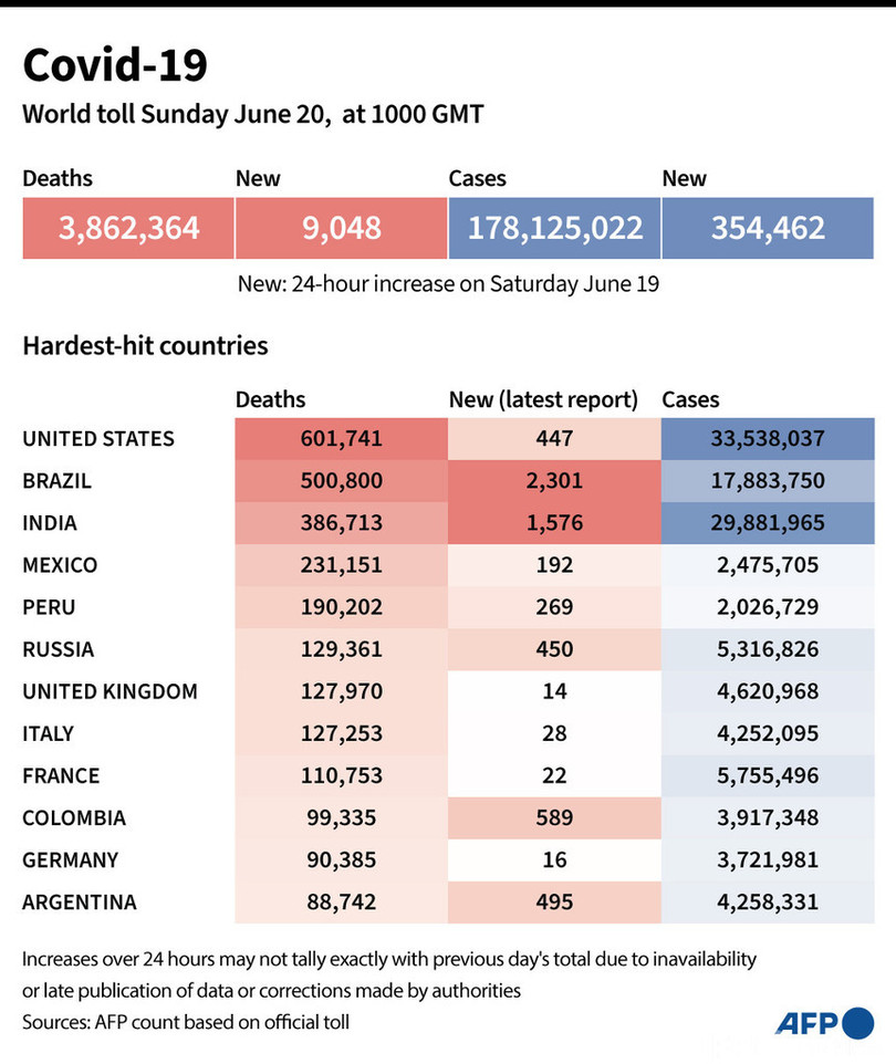 【6月20日 AFP】AFPが各国当局の発表に基づき日本時間20日午後7時にまとめた統計によると、世界の新型コロナウイルスによる死者数は386万2364人に増加した。