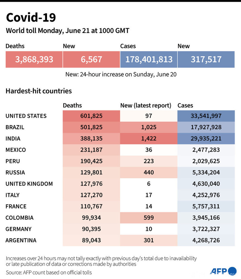 【6月21日 AFP】AFPが各国当局の発表に基づき日本時間21日午後7時にまとめた統計によると、世界の新型コロナウイルスによる死者数は386万8393人に増加した。