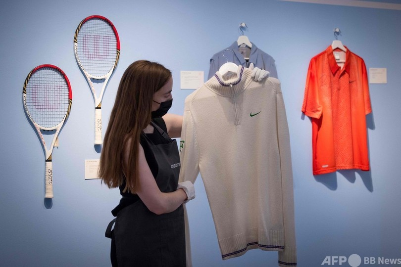 【6月22日 AFP】男子テニスのロジャー・フェデラー(Roger Federer、スイス)が過去の大会で使用したラケットやウエアなどが21日、英ロンドンの競売大手クリスティーズ(Christie’s)で報道陣に公開された。(c)AFP