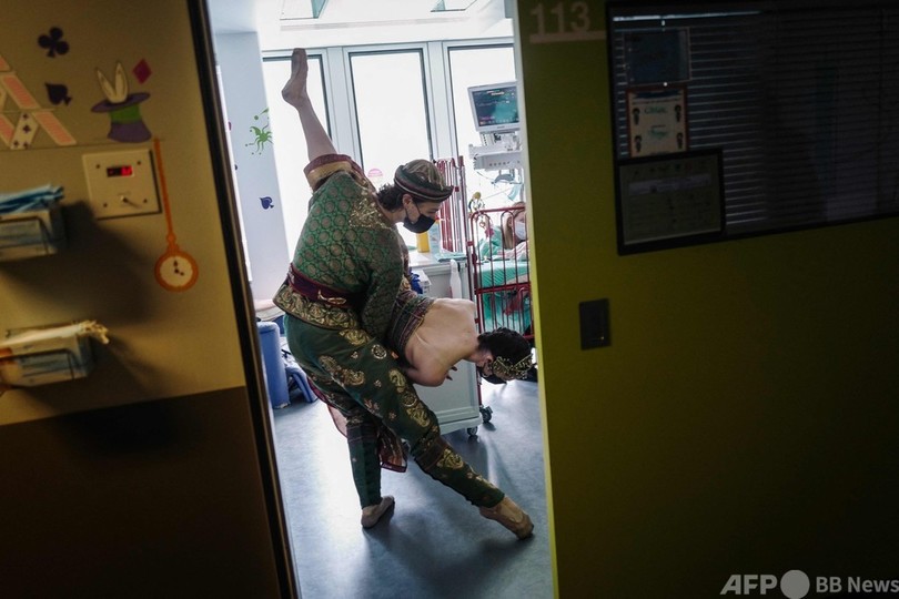 【6月27日 AFP】仏パリの病院の集中治療室で、きらびやかな衣装を身にまとったバレエダンサー2人がくるくる回るのを、挿管処置を受けている少年が熱心に見つめる。