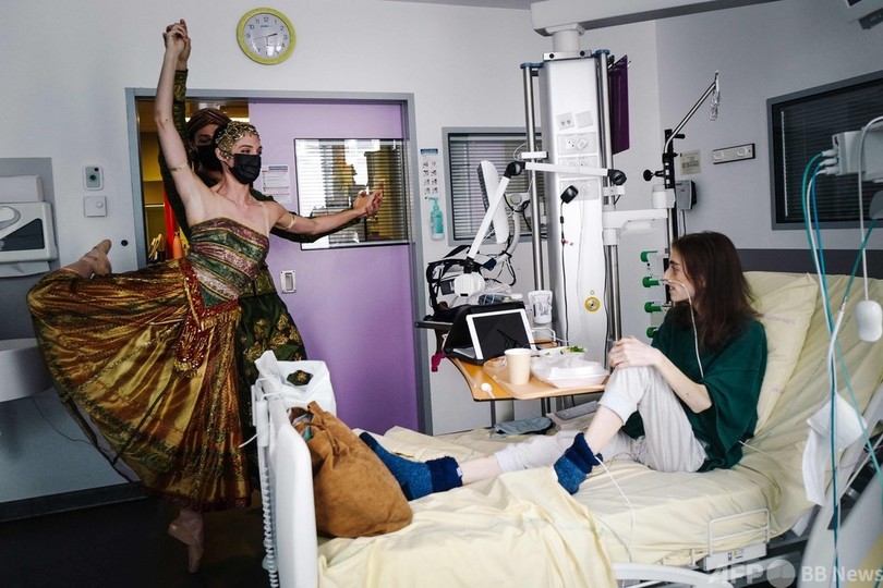 【6月27日 AFP】仏パリの病院の集中治療室で、きらびやかな衣装を身にまとったバレエダンサー2人がくるくる回るのを、挿管処置を受けている少年が熱心に見つめる。