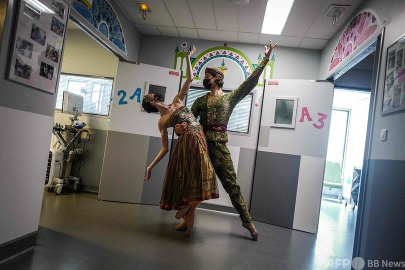 【6月27日 AFP】仏パリの病院の集中治療室で、きらびやかな衣装を身にまとったバレエダンサー2人がくるくる回るのを、挿管処置を受けている少年が熱心に見つめる。