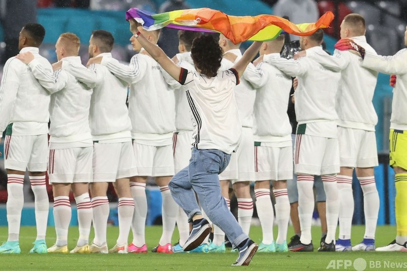 UEFAと先日反LGBTQ法案を可決したハンガリー政府には抗議が集まり、試合前には虹色の旗を持った人がピッチに乱入する一幕があった。ハンガリー国歌の演奏中に両チームの背後から侵入した若者は、整列する選手の前に立ちはだかったが、セキュリティーにつかみ倒されてピッチから連れ出された。(c)AFP