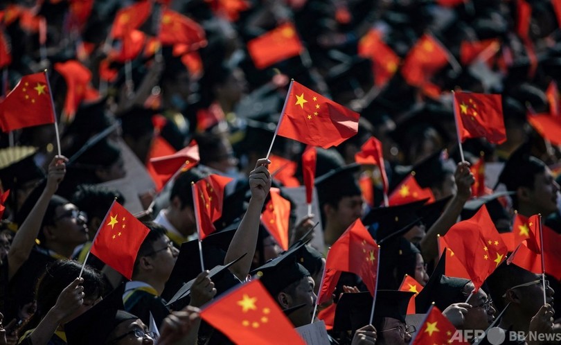 会場には中国共産党結党100年を祝うプレートが準備され、これを前に卒業生らが並び、記念撮影が行われた。多くの手には中国国旗が握られていた。(c)AFP